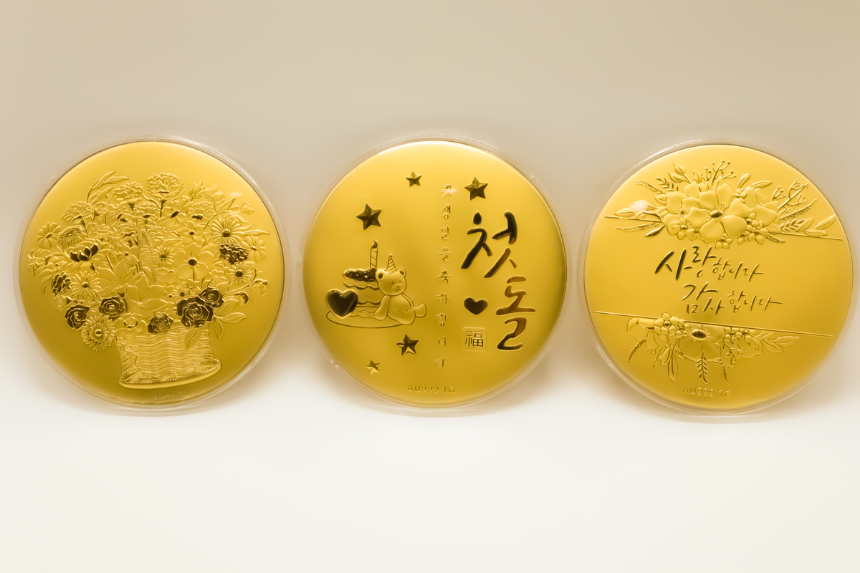 세 가지 디자인으로 제작된 원형 골드 바는