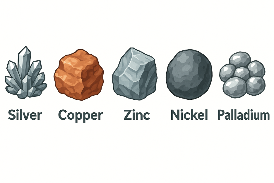 이렇게 은, 구리, 아연, 니켈, 팔라듐 등이